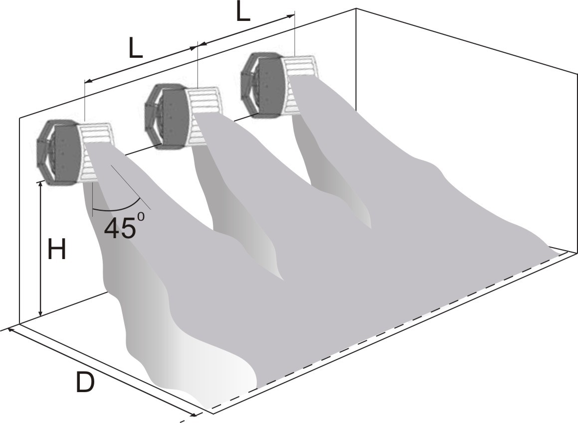Высота монтажа при направлении нагретой струи вертикально вниз (вода 95/700С, воздух 150С) - 4-8 м