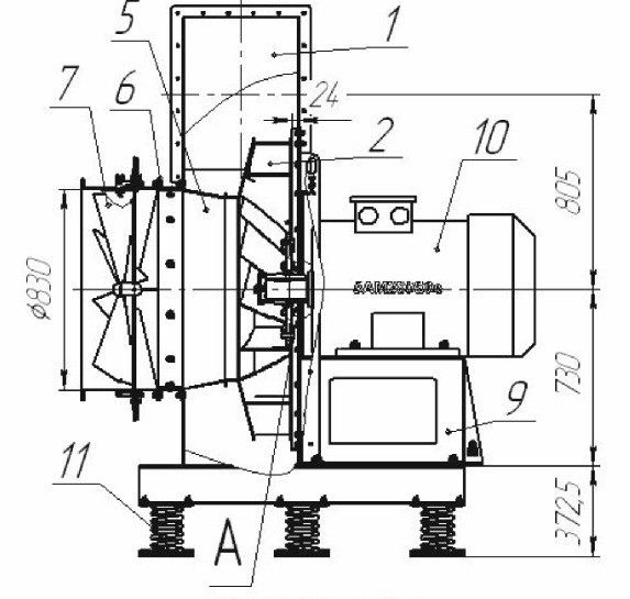 7 – Аппарат направляющий; 9 – Рама; 10 – Электродвигатель; 11 – Виброизолятор.