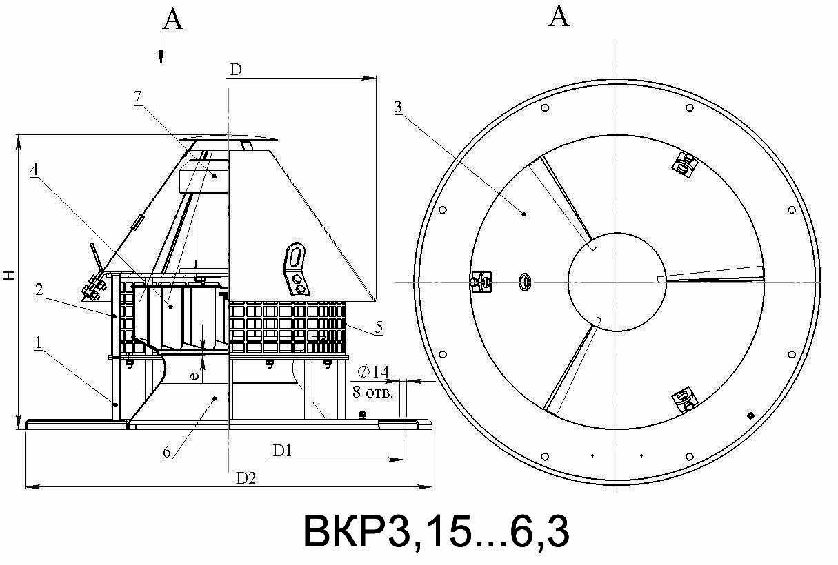 Вентилятор крышный радиальный состоит из следующих основных узлов: секция нижняя 1, секция верхняя 2, колпак 3, колесо рабочее 4, ограждение 5, входной патрубок (диффузор) 6, двигатель 7.