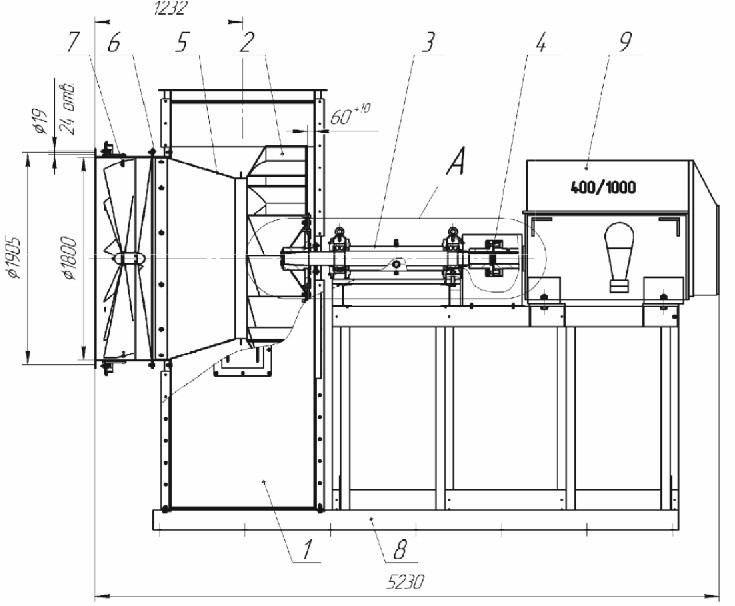 1 – корпус; 2 – колесо рабочее; 3 – подшипниковый узел; 4 – муфта; 5 – коллектор; 6 – фланец входной; 7 – аппарат направляющий; 8 – станина; 9 – электродвигатель.