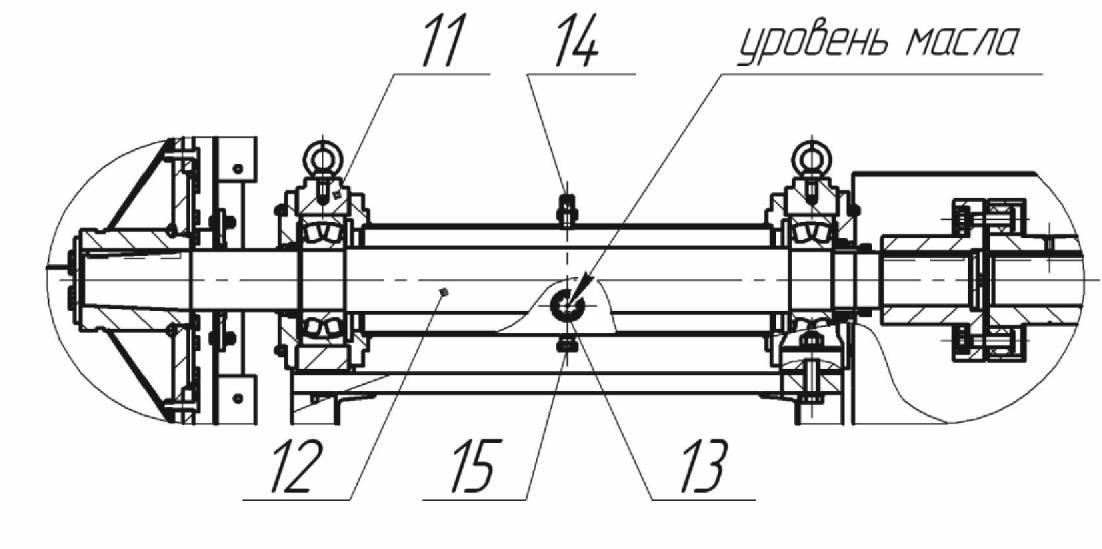 11 – корпус подшипника; 12 – вал; 13 – масломерный глазок; 14 – колпачок отдушина; 15 – колпачок сливной.